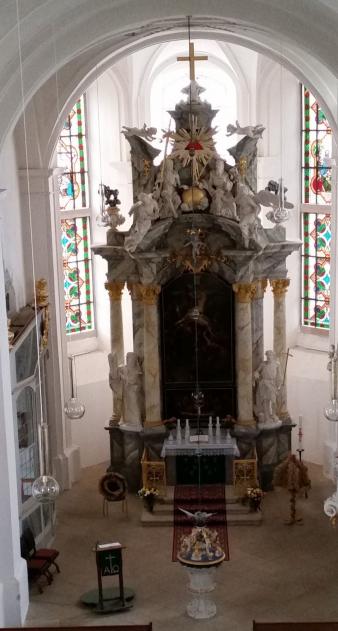 Der Altar, 1732 von C. Grahle geschaffen, verkündet in die Herrlichkeit Gottes und seine Zuwendung zum Menschen. Im Zentrum die Altargemälde – die Kreuzabnahme Jesu und das Abendmahl – vom Dresdener Hofmaler L.W.E. Dietrich 1733 gemalt. Im oberen Teil ist Gottes Dreieinigkeit (Symbol: rotes Dreieck) dargestellt. Gott der Schöpfer, hält das Zepter über seine Erde. Ihm gegenüber Jesus, vom dem es im Glaubensbekenntnis heißt „er sitzt zur Rechten Gottes, des allmächtigen Vaters“. Die Taube als Symbol für den Heiligen Geist darf nicht fehlen. Mose, der Überbringer der zehn Gebote mit zwei Steintafeln und Johannes der Täufer, der Vorläufer und Künder des Messias Jesus von Nazareth stehen lebensgroß zu beiden Seiten des Altartisches. Um diesen versammelt sich zum Heiligen Abendmahl die Christliche Gemeinde, hier legt sie ihre Dankopfergaben ab, hier gedenkt sie des Lebensopfers Jesu und erlebt Gemeinschaft mit ihm. Prächtig gestaltet steht vor der Gemeinde der Taufstein. Vier Reliefs, erzählen Szenen aus dem Leben von Jesus. Aufmerksamkeit erregt meist der formenreiche hölzerne Deckel. Leicht verzierte Bögen, zwischen den vergoldeten Putten Symbole des Glaubens tragen, tragen ein Nest, in dem ein Schwan mit seinen Jungen zu sehen ist. Der Künstler Andreas Böhme stellt eine rührende Legende dar, die schon im Altertum bekannt war, nach der eine Pelikanmutter ihre Jungen mit ihrem eigenen Blut tränkt, wenn in der Trockenheit keine Nahrung mehr zu finden ist. Die Kirchliche Tradition hat hierin eine Parallele zum Christus geschehen gesehen: Christus gibt sein Leben hin, damit die Seinen leben.