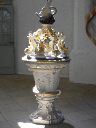Prächtig gestaltet steht vor der Gemeinde der Taufstein. Vier Reliefs, erzählen Szenen aus dem Leben von Jesus. Aufmerksamkeit erregt meist der formenreiche hölzerne Deckel. Leicht verzierte Bögen, zwischen den vergoldeten Putten Symbole des Glaubens tragen, tragen ein Nest, in dem ein Schwan mit seinen Jungen zu sehen ist. Der Künstler Andreas Böhme stellt eine rührende Legende dar, die schon im Altertum bekannt war, nach der eine Pelikanmutter ihre Jungen mit ihrem eigenen Blut tränkt, wenn in der Trockenheit keine Nahrung mehr zu finden ist. Die Kirchliche Tradition hat hierin eine Parallele zum Christusgeschehen gesehen: Christus gibt sein Leben hin, damit die Seinen leben.